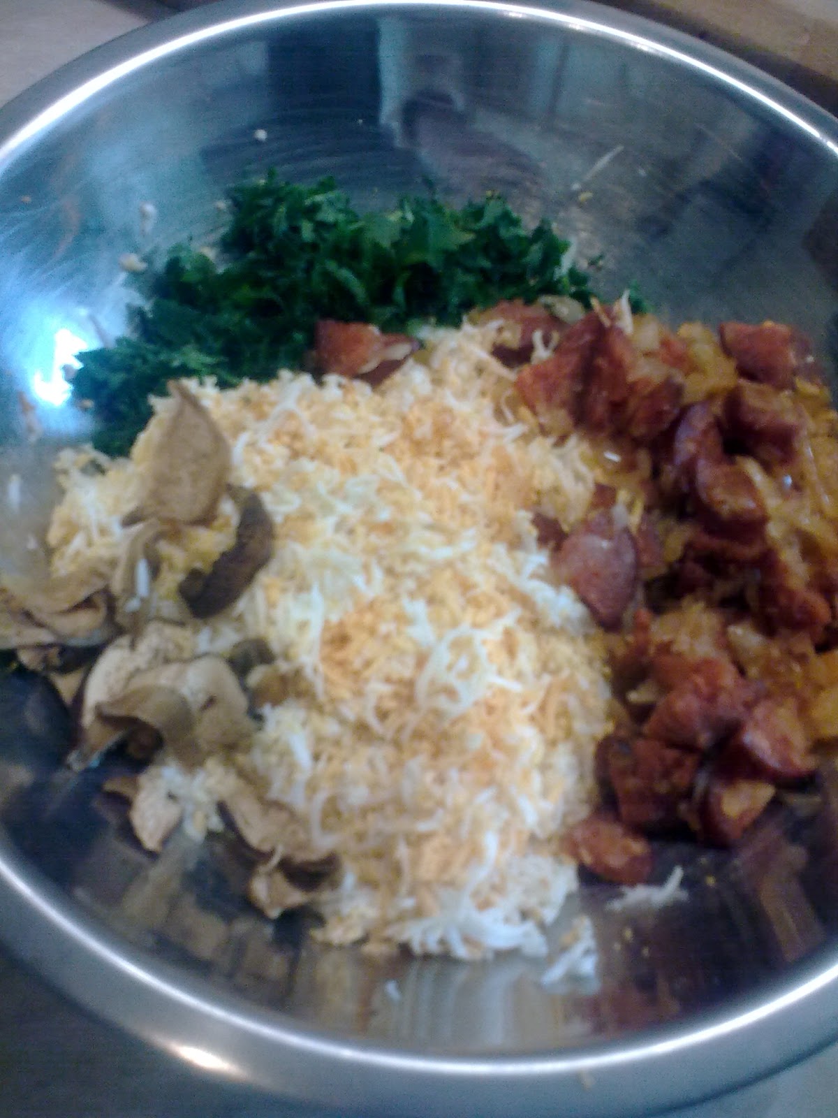 A vajon megdinsztelem a lereszelt hagymát,hozzáadom a kockára vágott kolbászt,éppen csak hogy piritok rajta,a tojásokat lereszelem,majd összekeverem a hagymás kolbásszal,apritott petrezselyemmel, a vargánya gombával,1 tojás sárgájával sót,borsot szórok rá izlés szerint,a tojásfehérjét habnak vertem,majd óvatosan hozzá kevertem a masszához.
